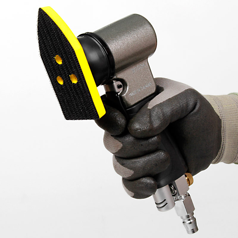 1.帶偏心式,裝砂紙打磨出來的效果是“霧”狀,帶細小亂絲的小紋路,適合后工藝需要做噴砂、烤漆,增加附著力。(標配一般為3mm偏擺,可選配1.5mm,0.75mm偏擺度)