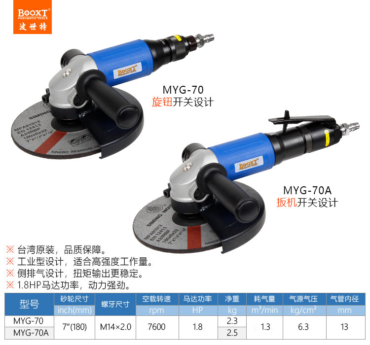 東莞市強(qiáng)勁五金工具有限公司提供臺(tái)灣BOOXT波世特品牌氣動(dòng)工具,7寸風(fēng)動(dòng)角磨機(jī)MYG-70廠家直銷,首件享特價(jià)。咨詢熱線:4008301980